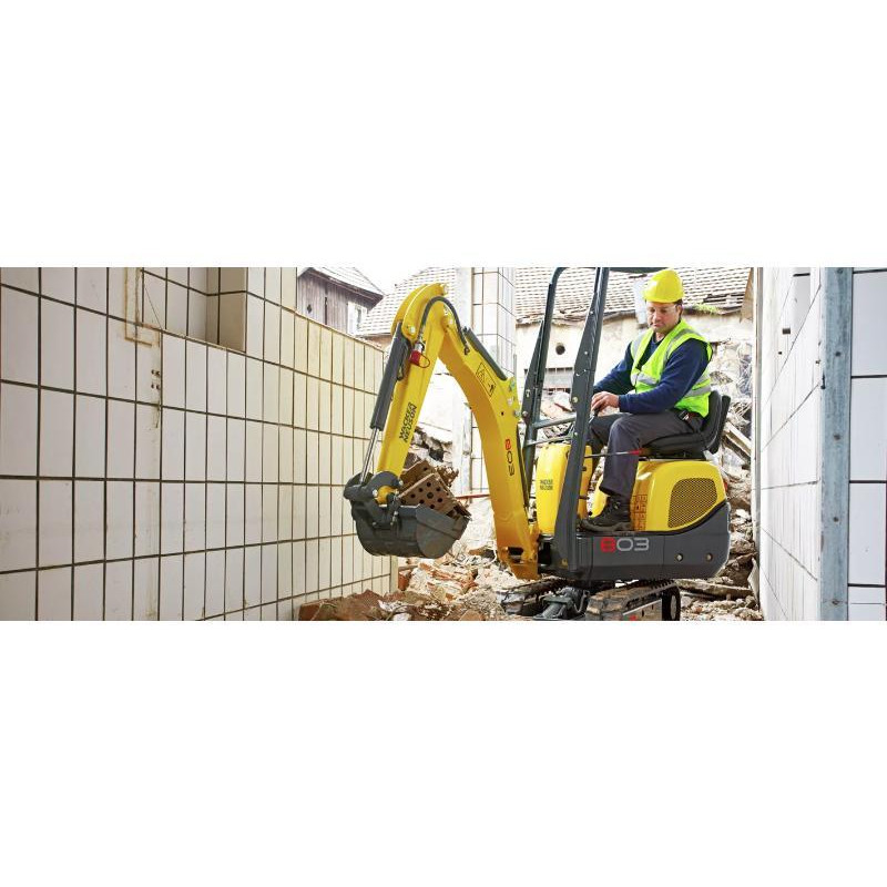 Pelle sur chenilles de petit gabarit. Puissante mais compacte, elle franchit les portes sans difficulté et n'abîme pas le revêtement du sol grâce à ses chenilles en caoutchouc. Sa puissance et ses équipements, tels que le marteau hydraulique peuvent être utilisés sans difficulté grâce au circuit hydraulique auxiliaire de série.
