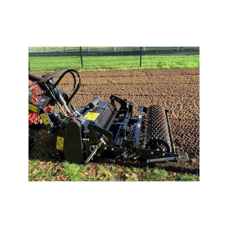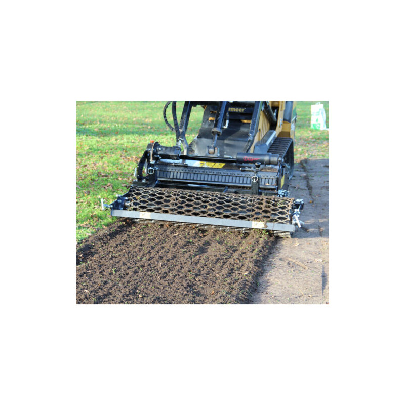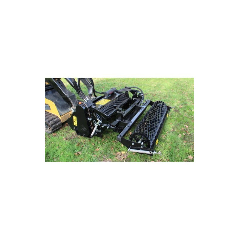 Préparateur de sols et enfouisseurs destinés aux mini-chargeus Skid-Steer. Il permet la création ou rénovation d'espaces verts en préparant le lit de demences avant l'engazonnement. Polyvalent, il permet de fraiser, d'enfouir (pierres, détritus, herbes...) de niveler, de malaxer et de rouler la surface. L'utilisation se fait en direct ou sur un terrain préalablement décompacté en profondeur et débarrassé des grosses pierres. Il est équié d'un rotor surdimensionné, de lames anti semelle, de doigts de grille de sélection, d'un système d'attache rapide conventionnel et d'une lame niveleuse.