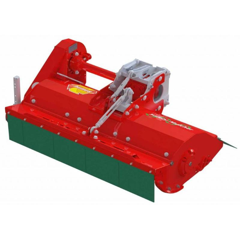 Broyeur à marteaux pour porteur un essieu, conçu pour une utilisation universelle. De construction compacte et basse, il convient au montage sur des motoculteurs. Aussi, son système flexible d'adaptation permet une utilisation facile et rapide sur un autre tracteur. Ses caisses renforcées ainsi que les roulements du rouleau stabilisateur et du rotor solides font de lui un partenaire fiable même pour les professionnels. Il dispose d'une bride de montage réglable, de patins, d'un rouleau stabilisateur pour une bonne adaptation au sol et une hauteur de coupe précise et d'un frein intégré dans le renvoi d'angle. Il offre une répartition régulière de la matière broyée derrière le rouleau stabilisateur