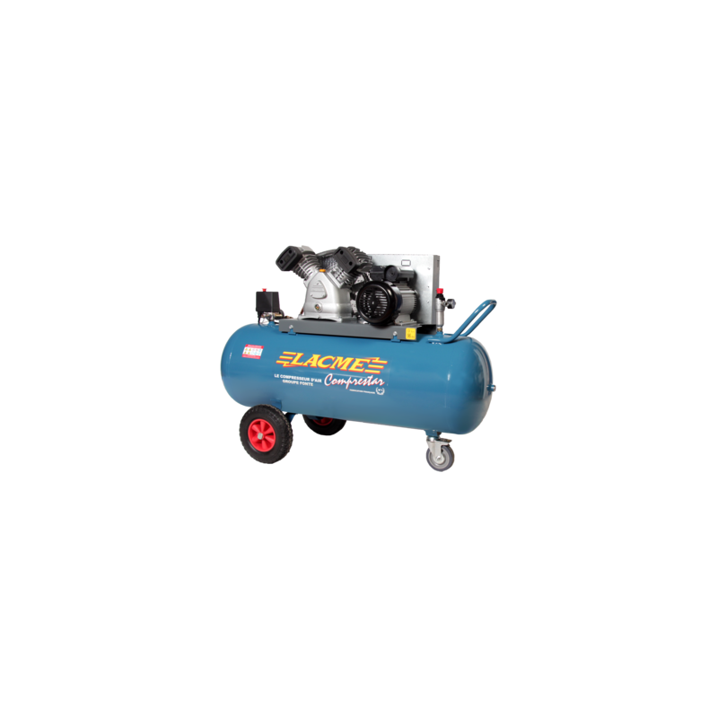 Compresseur professionnel mobile à entrainement par courroie, monophasé. Il dispose d'un brancard double, de grosses roues et d'une roue directrice avant avec frein pour un déplacement plus facile. Il a aussi une soupape d'aide au démarrage, une sortie directe avec raccord rapide et un épurateur détendeur PM avec doubles sorties.