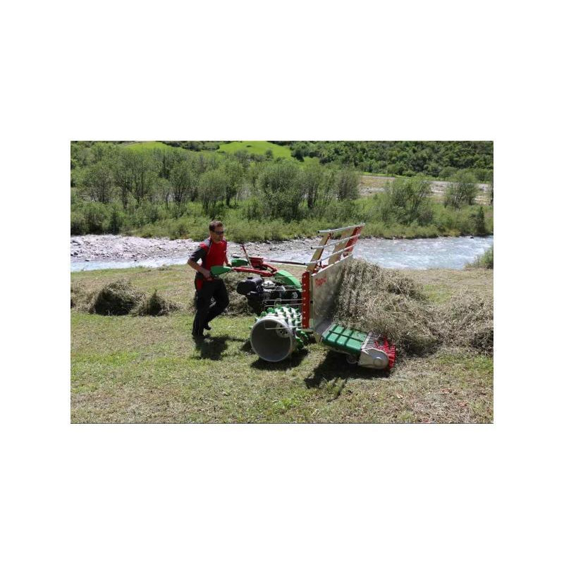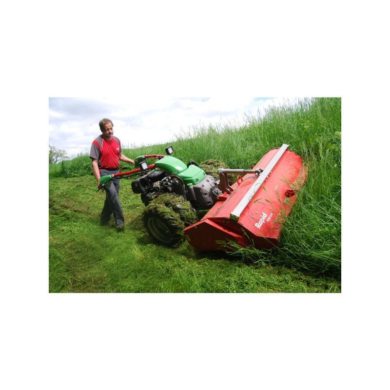Porte-outils hydrostatique avec direction hydraulique disposant de : la marche avant / arrière progressive commandée par poignée tournante, d'un guidon pivotant sur 230° pour travailler devant ou derrière l'outil, de la direction hydraulique active commandée au guidon et d'un attelage des outils par manchon frontal.