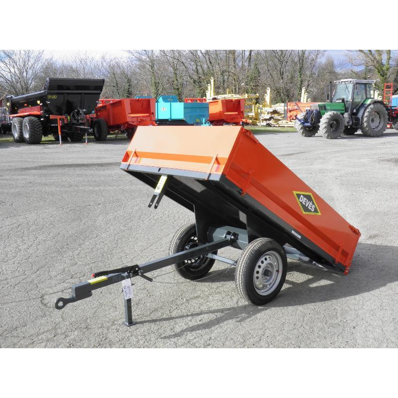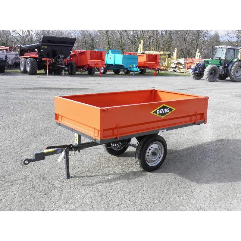 Remorque pour micro tracteur à basculement mécanique et attelage pour microtracteur + anneau tournant. Elle est équipée de ridelles démontables, de ranchers arrières amovibles, d'une béquille et d'un frein de parking.