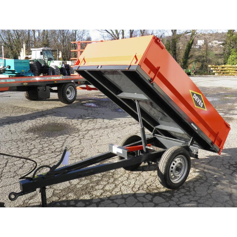 Remorque pour microtracteur équipé de ridelles démontables, de ranchers arrières amovibles, d'un attelage microtracteur et anneau tournant, d'une béquille et d'un frein de parking. Il offre également un basculement hydraulique.